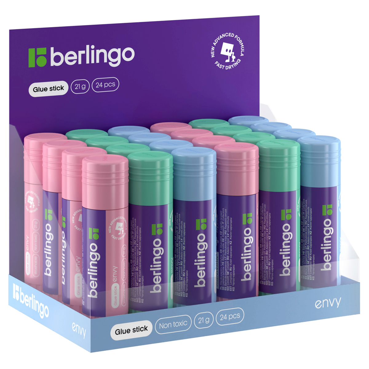Клей-карандаш ПВП Berlingo кросс-серии Envy – отличный помощник для склеивания изделий из бумаги и картона. Вес – 21 грамм. Клей белого цвета легко и равномерно наносится на поверхность тонким слоем, что позволяет экономично его расходовать. Клей имеет уникальную формулу на основе ПВП, он не токсичен и не содержит растворителей. Экономичен в использовании и не имеет неприятного запаха. Круглый корпус имеет матовое покрытие и представлен в 3 нежных цветах. Поставляется в прозрачных дисплей-боксах. <br/>• Цвет клея: белый;<br/>• Вес: 21 г.