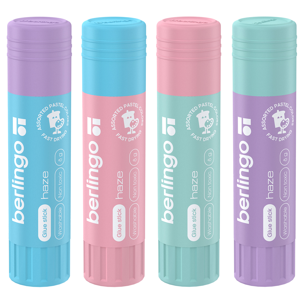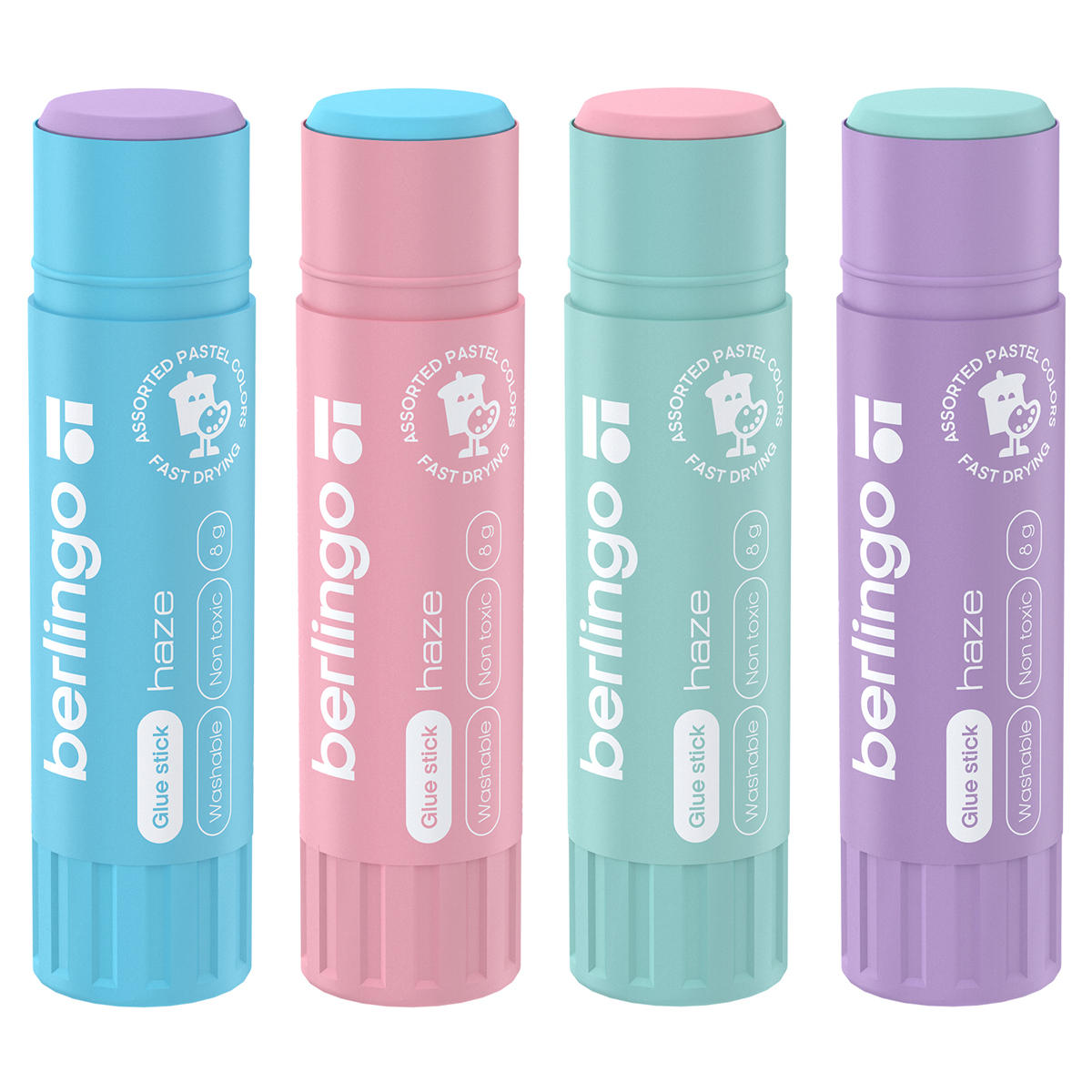 Клей-карандаш ПВП Berlingo Haze – отличный помощник для склеивания изделий из бумаги и картона, ткани, фотографии. Вес – 8 грамм. Клей имеет уникальную формулу на основе ПВП с добавлением цветового пигмента пастельного оттенка. Представлен в ассорти из 4 цветов: голубой, лиловый, розовый и бирюзовый. Не токсичен, не содержит растворителей. Не имеет неприятного запаха. Экономичен в использовании. Не деформирует бумагу и не оставляет следов после высыхания. Корпус имеет матовое покрытие и выполнен в дизайнах пастельных тонов. Упаковка – прозрачный дисплей-бокс. Является частью одноименной кросс-серии продукции бренда Berlingo.