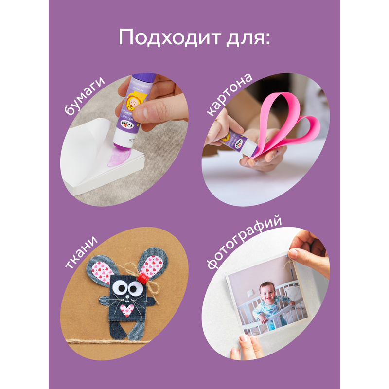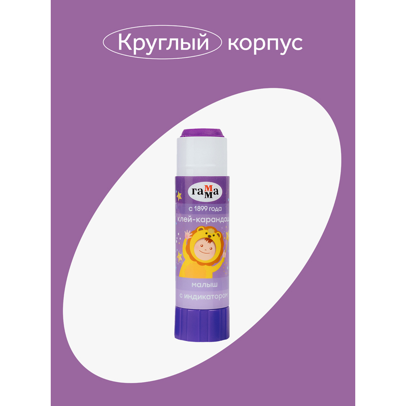 Клей-карандаш ПВП ГАММА серии «Малыш» является незаменимым помощником на уроках труда и занятиях творчеством! Вес - 16 граммов. Клей имеет индикатор фиолетового цвета, который позволяет определить место нанесения на поверхности. Спустя несколько секунд индикатор становится прозрачным. Клей легко наносится и распределяется по поверхности, оставляя тонкий и ровный клеевой слой, что позволяет расходовать его экономично. Он не деформирует поверхность бумаги. Позволяет хорошо склеивать изделия из бумаги, картона, ткани, фотографии. Качество клея соответствует европейским стандартам. Он безопасен для детей, так как производится из глицерина. Круглый корпус удобно лежит в руке. Поставляется в дисплей-боксах.<br/>• Цвет клея: фиолетовый;<br/>• Вес: 16 г.