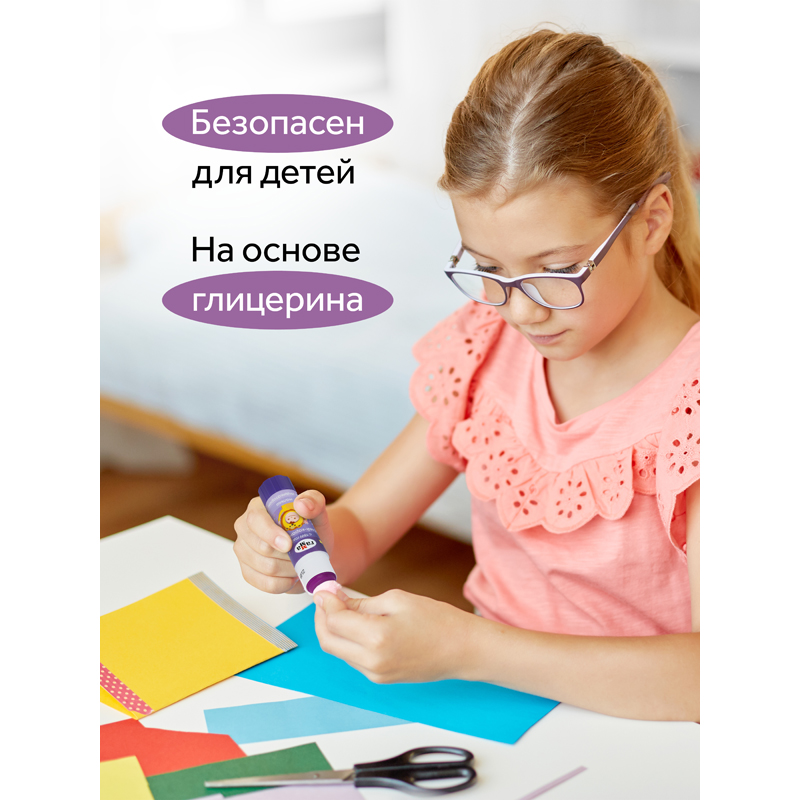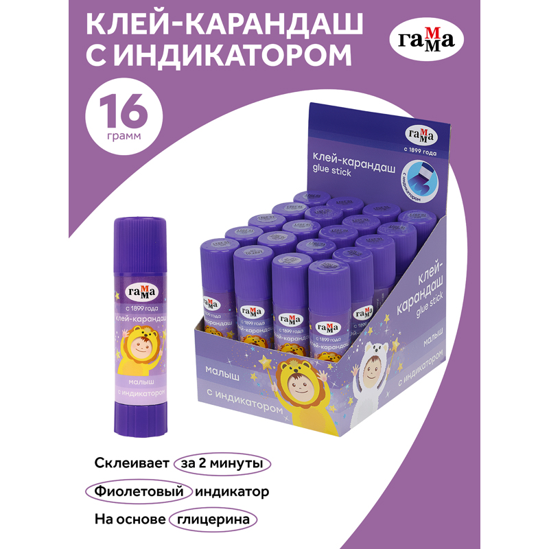 Клей-карандаш ПВП ГАММА серии «Малыш» является незаменимым помощником на уроках труда и занятиях творчеством! Вес - 16 граммов. Клей имеет индикатор фиолетового цвета, который позволяет определить место нанесения на поверхности. Спустя несколько секунд индикатор становится прозрачным. Клей легко наносится и распределяется по поверхности, оставляя тонкий и ровный клеевой слой, что позволяет расходовать его экономично. Он не деформирует поверхность бумаги. Позволяет хорошо склеивать изделия из бумаги, картона, ткани, фотографии. Качество клея соответствует европейским стандартам. Он безопасен для детей, так как производится из глицерина. Круглый корпус удобно лежит в руке. Поставляется в дисплей-боксах.