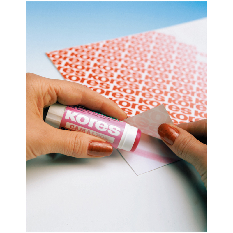 Клей-карандаш Kores Chameleon предназначен для склеивания бумаги и картона. Вес — 15 г. Оставляет цветной след, который позволяет точно определить место нанесения и затем обесцвечивается. Клей легко смывается водой и отстирывается, не имеет запаха. Быстро сохнет, расходуется экономично. Безопасен для детей. Клей содержит глицерин. Характерной особенностью является возможное выделение глицериновых капель на поверхности данного клея, что придает легкость скольжения и возможность легкого нанесения клея на бумагу, тем самым обеспечивая экономичное расходование клея. Единичная упаковка — блистер.
