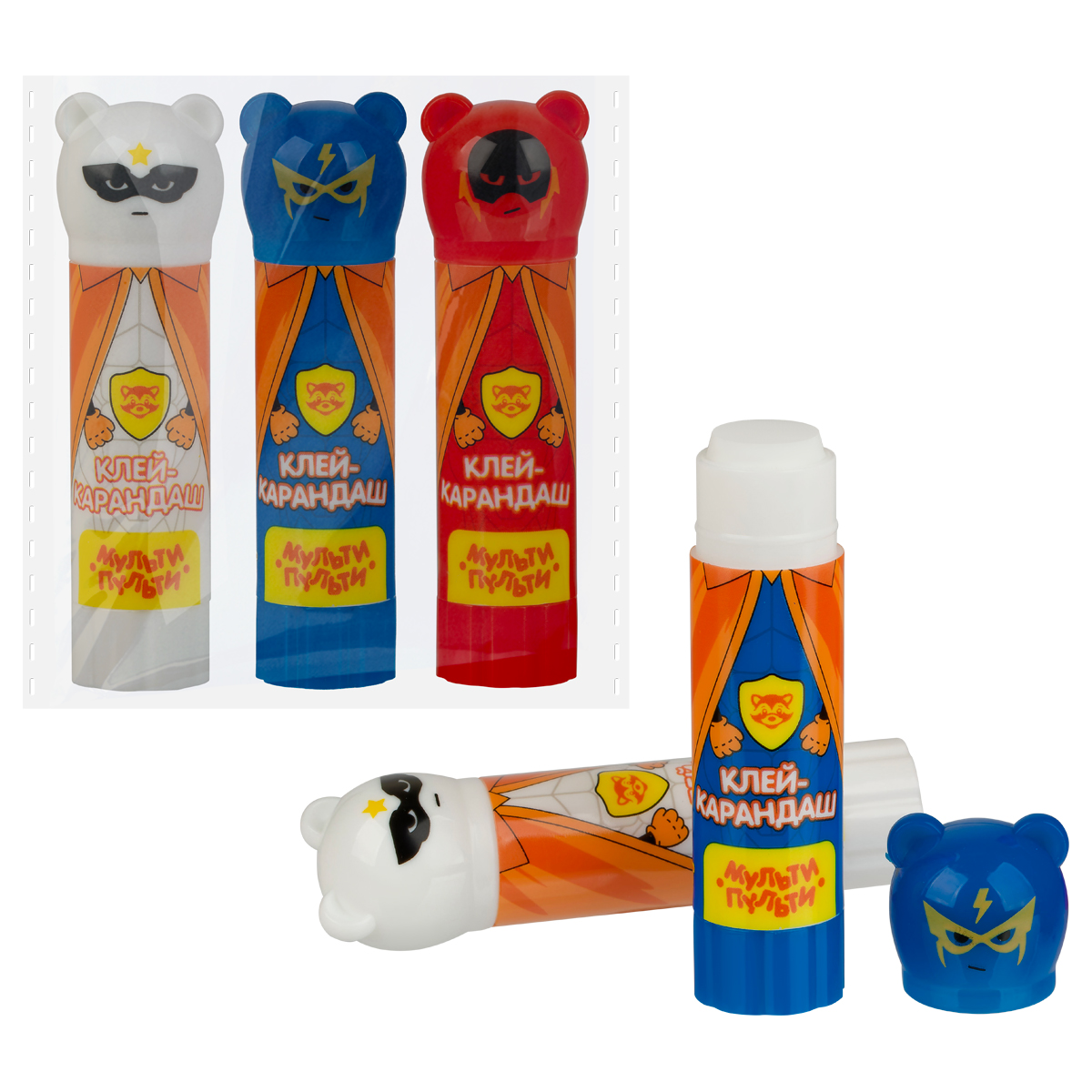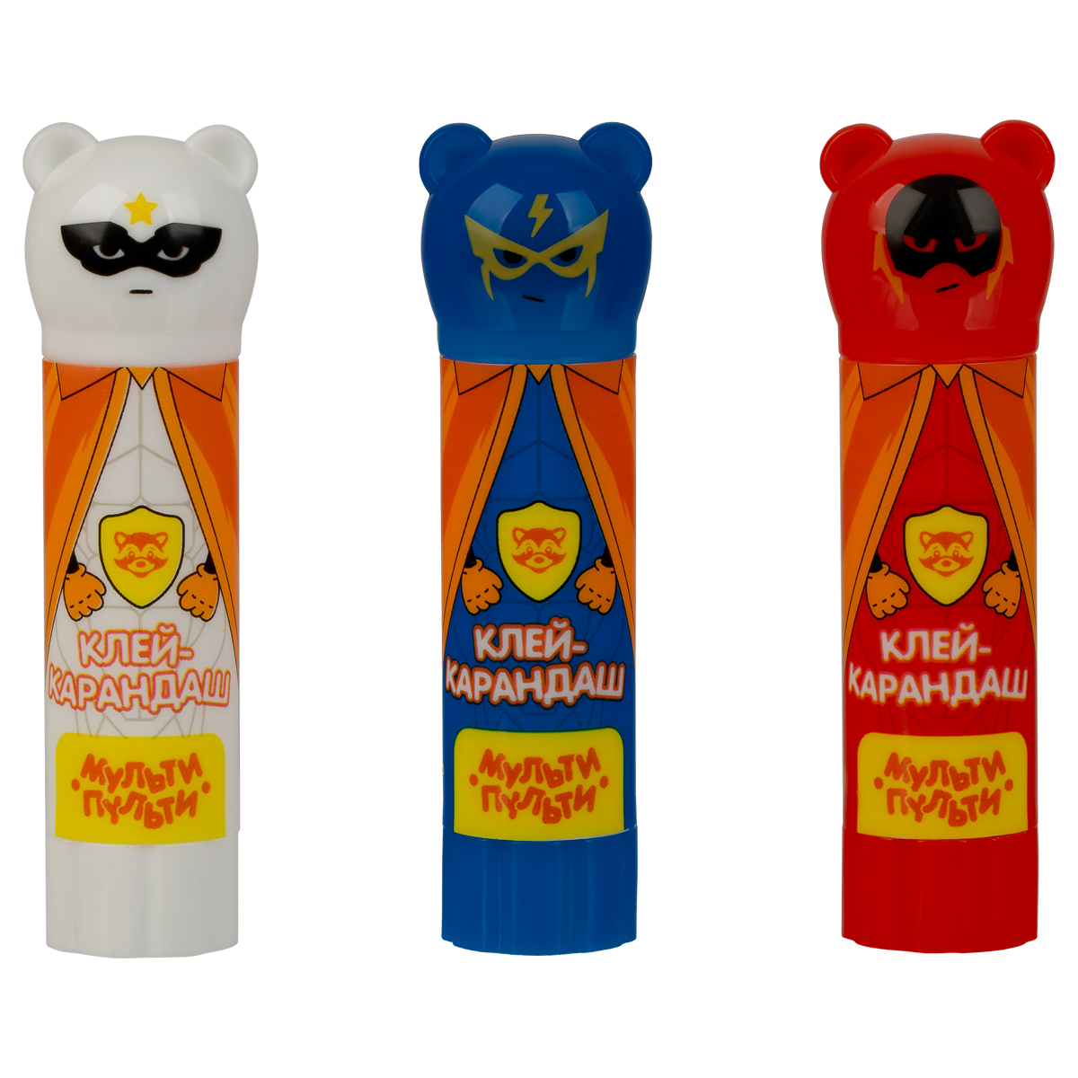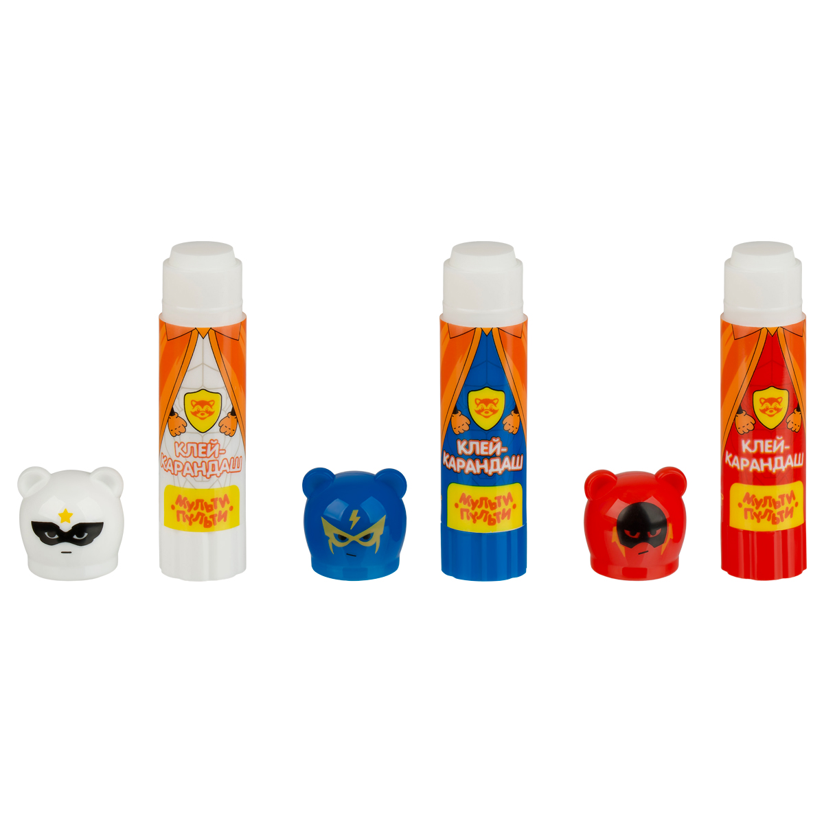 Клей-карандаш «Мульти-Пульти» «Супергерои» с фигурным колпачком – незаменимый помощник на уроках труда и занятиях творчеством. В набор входит 3 клея-карандаша по 9 граммов. Улучшенная формула на основе ПВП позволяет хорошо склеивать изделия из бумаги, картона, ткани. Клей быстро сохнет, нейтрален по запаху, легко смывается водой, не токсичен. Состав не содержит растворителей. Экономичный расход позволяет заниматься творчеством каждый день. Колпачки в форме супергероев подойдут для пальчиковых игр, поднимая настроение в процессе творчества. Набор упакован в пакет с этикеткой.<br/>• Вес нетто: 9 г;<br/>• Назначение: бумага, картон, ткань, фотографии;<br/>• Основа: ПВП;<br/>• Форма корпуса: круглая;<br/>• Цвет клея: белый.