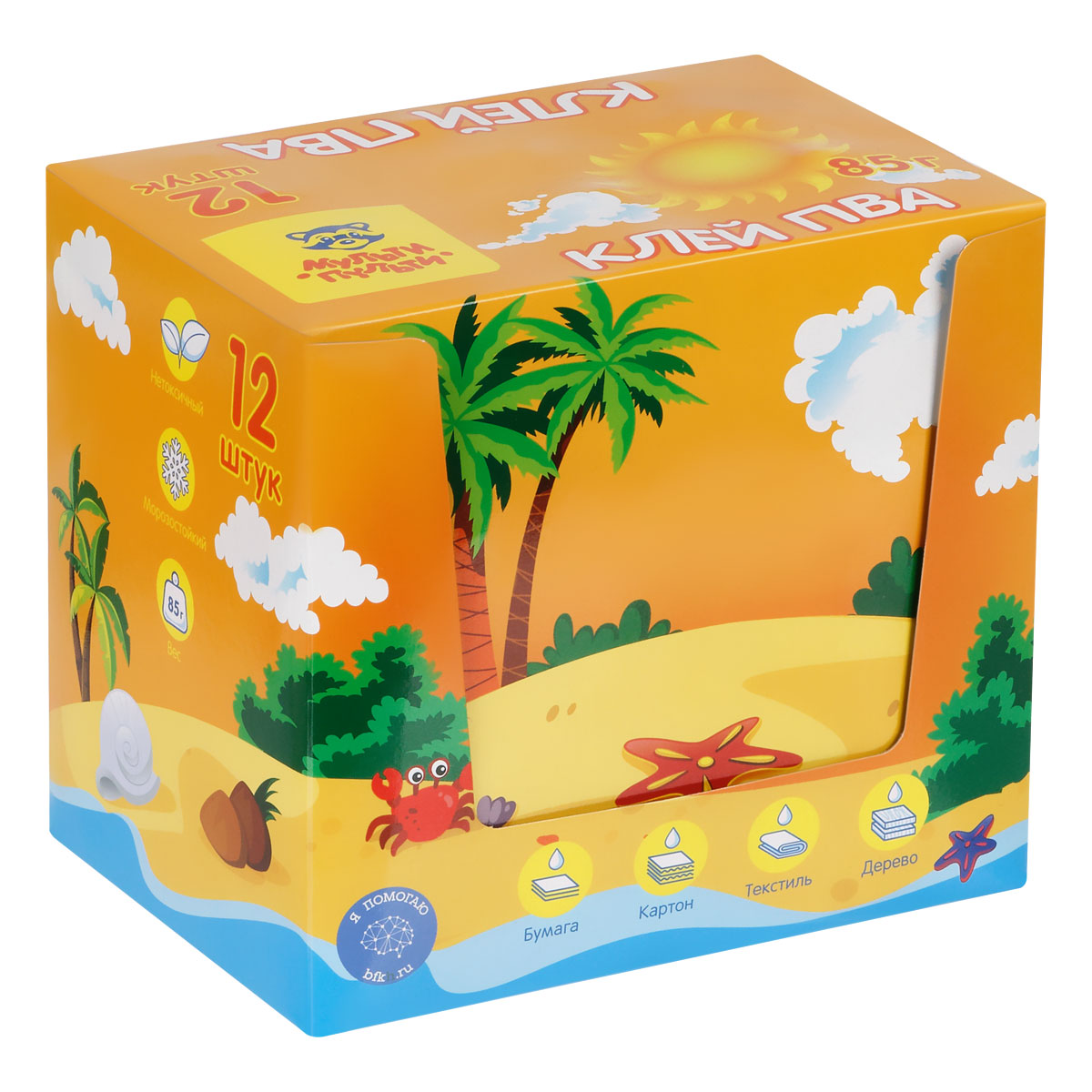 Клей морозостойкий. Рекомендуется хранить при температуре выше 0°С. Перед использованием необходимо взболтать. Клей упакован в дисплей-бокс по 12 штук. Для детей старше 3-х лет.