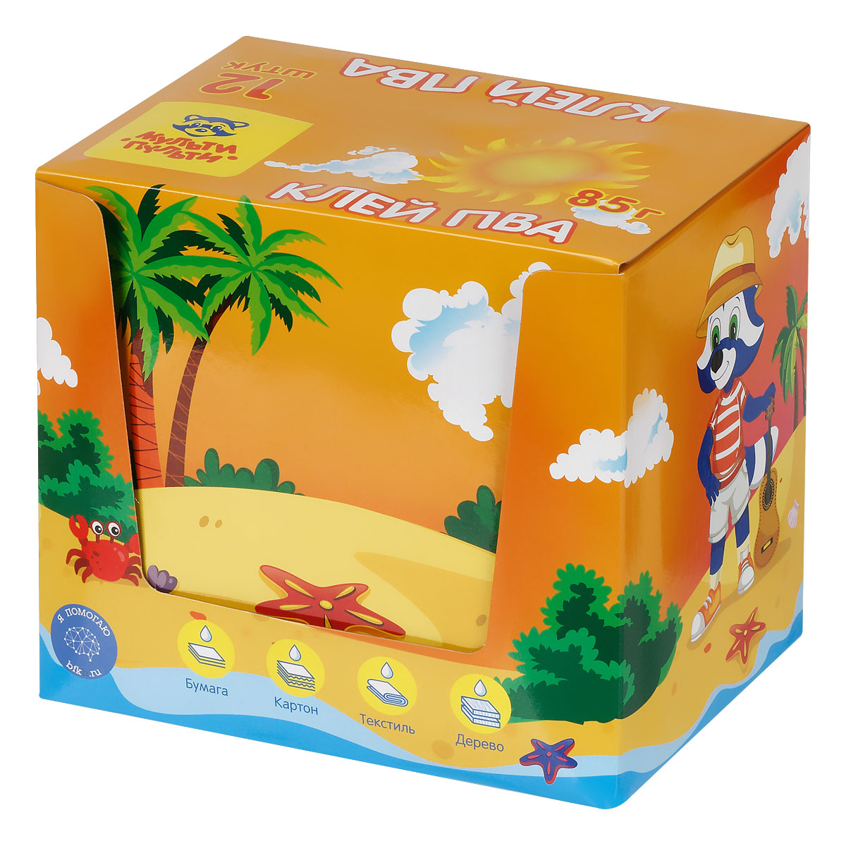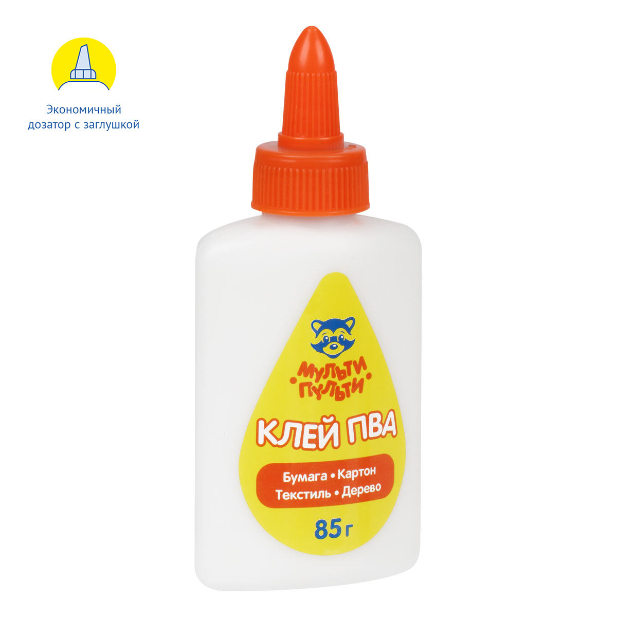 Клей ПВА «Мульти-Пульти» серии «Енот на Кубе» белого цвета подходит для создания поделок и работы на уроках труда. Он предназначен для склеивания бумаги, картона, дерева и ткани. Клей с улучшенным составом концентрированный, равномерно наносится на поверхность и надёжно скрепляет. Больший сухой остаток, который образуется после испарения жидких компонентов, позволяет с лёгкостью склеивать даже тяжелые материалы. <br/>Дозатор с заглушкой контролирует количество клея, необходимое для каждой склейки. У ребёнка не получится выдавить из тюбика сразу слишком много. Все нетто – 85 г. <br/>Клей морозостойкий. Рекомендуется хранить при температуре выше 0°С. Перед использованием необходимо взболтать. Клей упакован в дисплей-бокс по 12 штук. Для детей старше 3-х лет. <br/>• Вес: 85 г;<br/>• Морозоустойчивость: да;<br/>• Наличие дозатора: да.