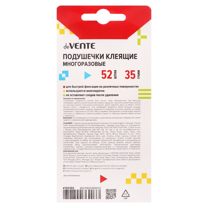 Клеящие подушечки (точки) 35г, 56 штук, 15х15мм, deVENTE, 2 листа, двусторонние, прозрачные, европодвес