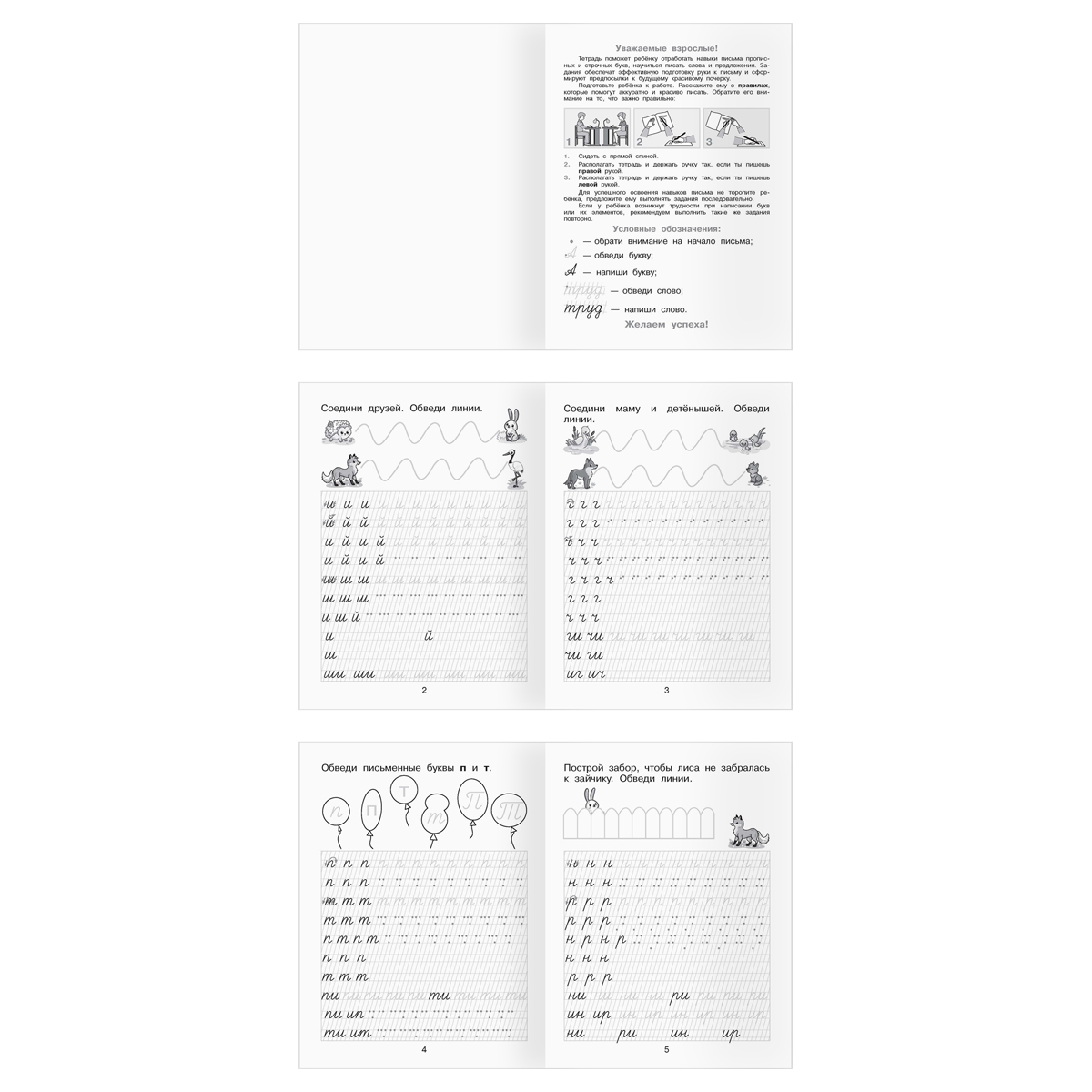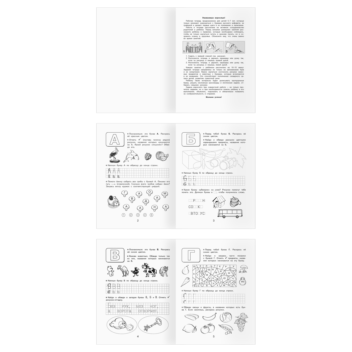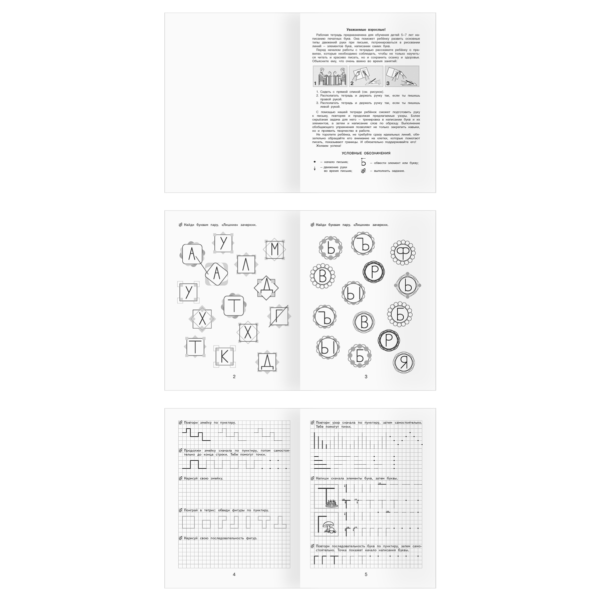 Рабочие тетради предназначены для занятий с детьми 5–7 лет. "Пишем буквы" - пособие научит ребёнка писать прописные буквы. Тетрадь содержит задания на повторение элементов узоров и букв, написание отдельных букв, букв в словах, а также на исправление неверно написанных букв. Пособие направлено на развитие мелкой моторики и элементарных навыков каллиграфического письма. "За буквой буква" - тетрадь знакомит дошкольников с буквами русского алфавита. Она поможет в овладении начальными навыками правописания печатных букв, содержит задания на запоминание букв, составление слогов, сопоставление буквы и звука. Упражнения разовьют мелкую моторику, внимание, память и пополнят словарный запас. "Развиваем навыки письма" - пособие поможет научиться писать красиво. Ребёнок освоит навыки письма, научится писать буквы, слова и предложения. Пособие поможет развить внимательность, зоркость, мелкую моторику. "Первые шаги в письме" - пособие поможет ребенку сделать первые шаги в написании букв русского алфавита. Тетрадь содержит задания на повторение элементов узоров, а также деталей, затем элементов букв, отдельных букв и букв в слове. Ребенок сможет развить графические навыки, сформировать зрительный образ буквы.