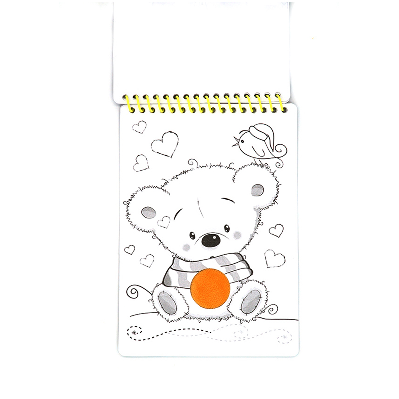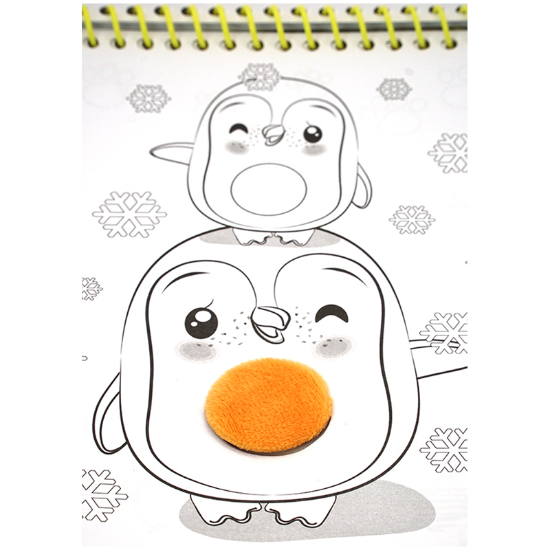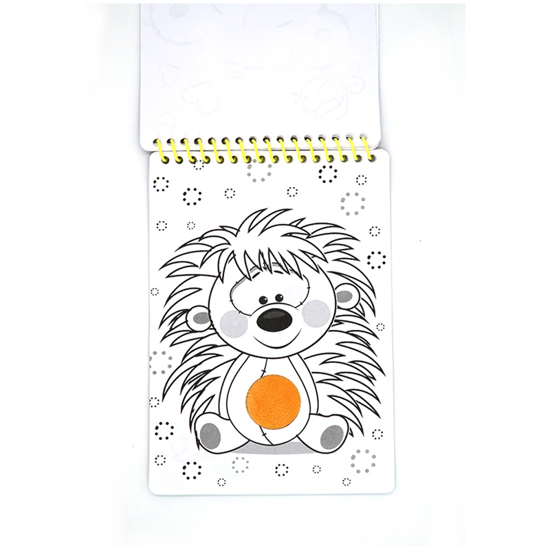 Раскраска-блокнот с объемной аппликацией формата А5. Обложка с высечкой, через которую выступает объемная аппликация. Внутренний блок - офсетная бумага плотностью 80 г/м2, 20 листов. Все листы имеют высечку, через которую выступает объемная аппликация. 16 листов - раскраска, на каждом листе забавное животное. 4 листа белых для того, чтобы ребенок сам нарисовал что-то интересное. Подложка из толстого мелованного картона, на который приклеена объемная аппликация. Крепление – евроспираль.