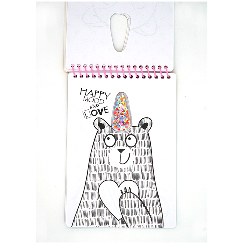Раскраска-блокнот с объемной аппликацией формата А5. Обложка с высечкой, через которую выступает объемная аппликация. Внутренний блок - офсетная бумага плотностью 80 г/м2, 20 листов. Все листы имеют высечку, через которую выступает объемная аппликация. 16 листов - раскраска, на каждом листе забавное животное. 4 листа белых для того, чтобы ребенок сам нарисовал что-то интересное. Подложка из толстого мелованного картона, на который приклеена объемная аппликация. Крепление – евроспираль.