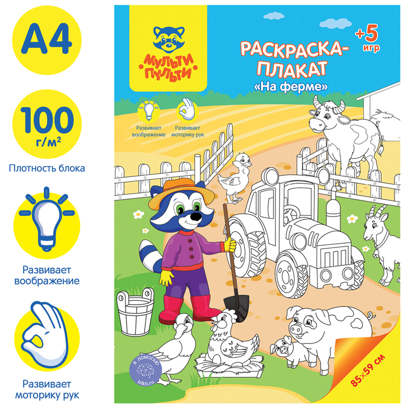 Раскраска-плакат «Мульти-Пульти» – это настоящая находка для тех, кто хочет увлечь своего ребёнка на долгое время. Формат: А4. Размер в разложенном виде – 850*590 мм. Такие раскраски полезны для развития мелкой моторики и воображения ребёнка с раннего возраста. Раскраска-плакат впишется в детские утренники и праздники. Малыши научатся подбирать цвета и комбинировать их. Плотная бумага подходит для раскрашивания цветными ручками, карандашами, фломастерами, маркерами и даже красками. На обратной стороне вы найдете 5 увлекательных игр. <br/>• Тип: плакат;<br/>• Формат: А4; <br/>• Размер: 850*590 мм; <br/>• Количество листов: 1.