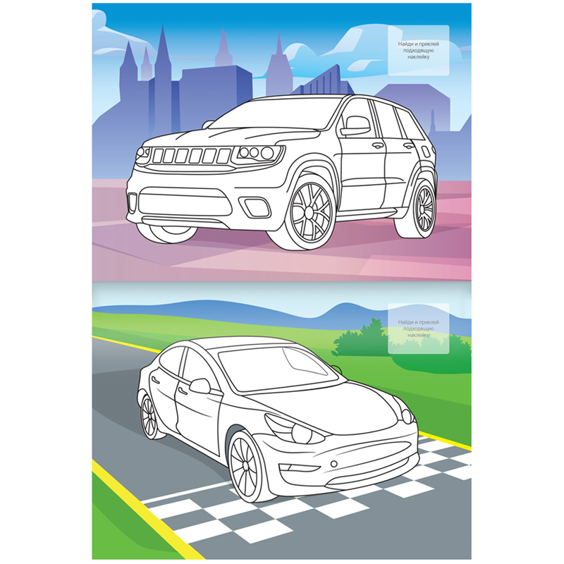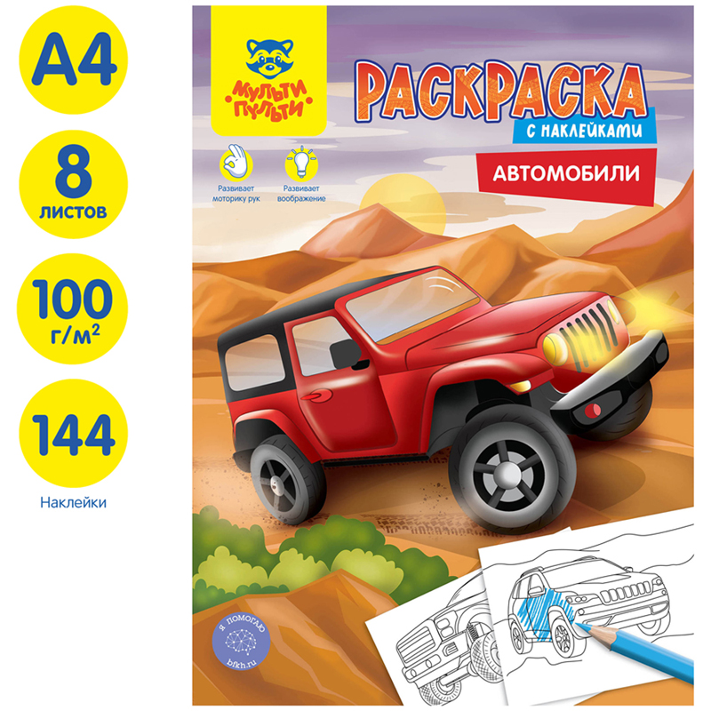 Раскраска с наклейками от бренда «Мульти-Пульти» – незаменимый помощник в творческом развитии ребёнка. Раскраска имеет размер 210*290 мм и содержит 16 сюжетов на тему "Автомобили", а также блок уникальных наклеек, которые можно использовать в процессе раскрашивания. Часть картинок содержит контуры и точки, которые нужно обвести или соединить по порядку перед раскрашиванием, что добавляет интереса в творческий процесс и делает его еще более увлекательным. Внутренний блок – офсетная бумага плотностью 100 г/кв. м., соответствуюет техническому регламенту о безопасности детей и подростков.<br/>Раскрашивание развивает мелкую моторику, воображение, способствует формированию цветового восприятия ребёнка. Товар не имеет возрастных ограничений.