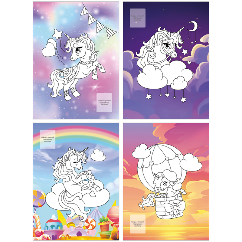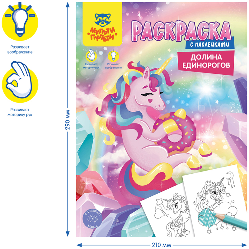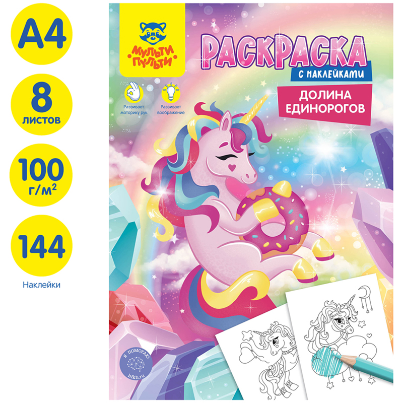 Раскраска с наклейками от бренда «Мульти-Пульти» – незаменимый помощник в творческом развитии ребёнка. Раскраска имеет размер 210*290 мм и содержит 16 сюжетов на тему "Единороги", а также блок уникальных наклеек, которые можно использовать в процессе раскрашивания. Часть картинок содержит контуры и точки, которые нужно обвести или соединить по порядку перед раскрашиванием, что добавляет интереса в творческий процесс и делает его еще более увлекательным. Внутренний блок – офсетная бумага плотностью 100 г/кв. м., соответствуюет техническому регламенту о безопасности детей и подростков.<br/>Раскрашивание развивает мелкую моторику, воображение, способствует формированию цветового восприятия ребёнка. Товар не имеет возрастных ограничений.