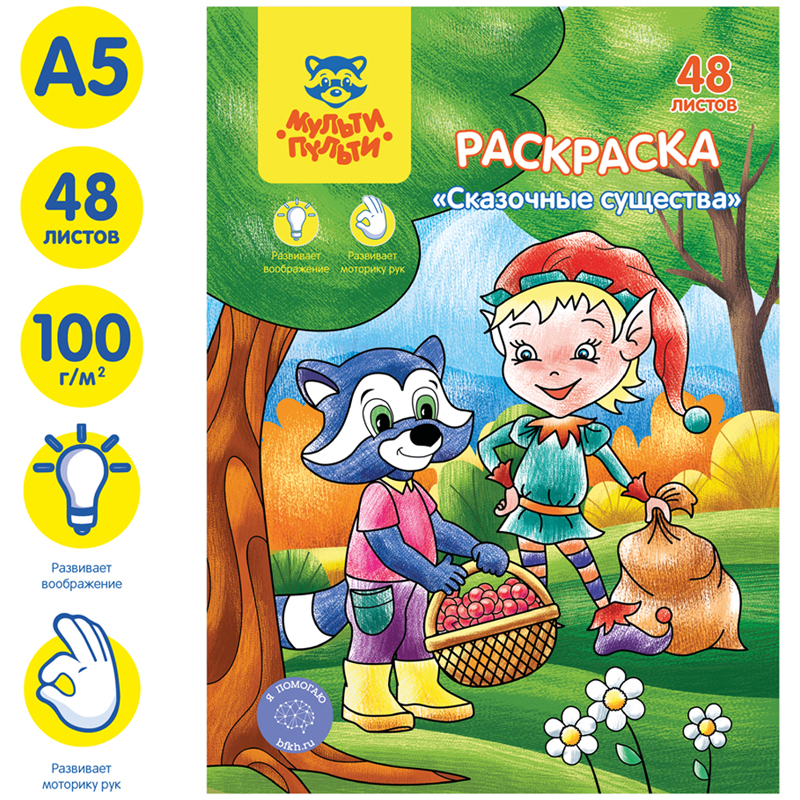 Раскраска бренда «Мульти-Пульти» – незаменимый помощник в творческом развитии ребёнка. Изделие серии «Сказочные животные» формата А5 и размера 165*235 мм состоит из 48 отдельных листов офсетной бумаги плотностью 100 г/кв. м, что соответствует техническому регламенту ТР ТС 007/2011 «О безопасности продукции, предназначенной для детей и подростков». Листы упакованы в картонную папку. Благодаря отдельным листам раскрашивать сюжеты и персонажей станет гораздо удобнее. Также можно часть взять с собой в дорогу, в гости или распределить листы с разными сюжетами среди нескольких детей, будь то дома, в детском саду или начальных классах.<br/>Раскрашивание развивает мелкую моторику, воображение, способствует формированию цветового восприятия ребёнка. Товар предназначен для детей старше 3-х лет.<br/>• Тип: стандартная;<br/>• Формат: А5;<br/>• Количество листов: 48;<br/>• Тип скрепления: папка.