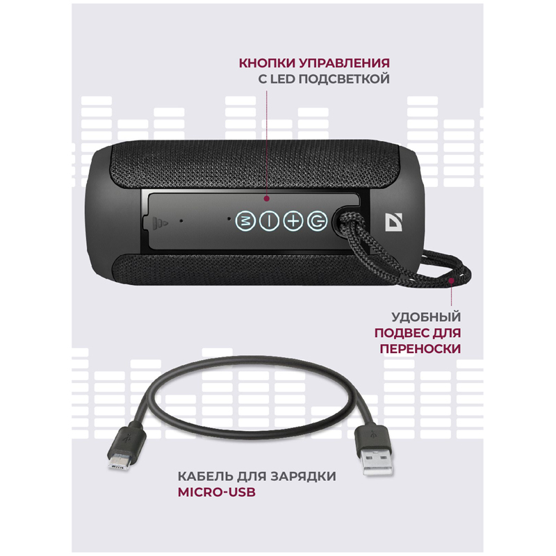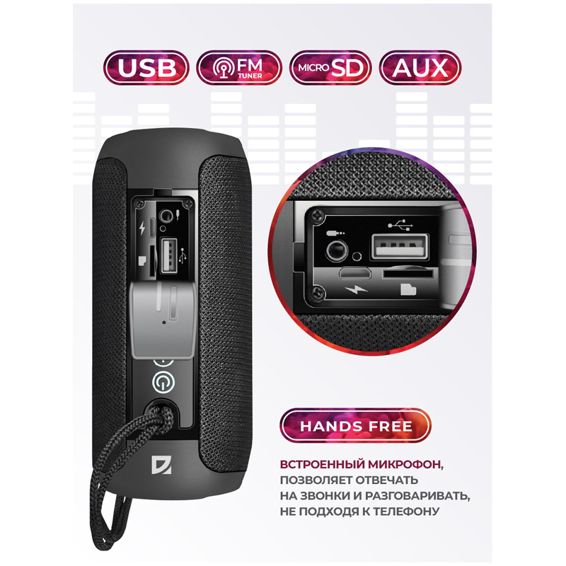 Bluetooth 5.0.<br/>Новый стандарт увеличивает скорость передачи данных в 2 раза, радиус действия в 4 раза, а энергоемкость этого процесса существенно ниже, чем у предыдущих версий модулей беспроводной связи.<br/>Встроенный MP3-плеер.<br/>Поддержка USB-накопителей и MicroSD-карт.<br/>Встроенный FM-приемник.<br/>Встроенный тюнер превращает колонку в полноценный радиоприемник. Вы всегда сможете послушать ваши любимые радиопередачи или музыку.<br/>Дополнительный AUX-аудиовход.<br/>Функция Hands free.<br/>Отвечайте на звонки и разговаривайте, не подходя к телефону. Встроенный микрофон позволяет общаться через колонку - так, как будто вы говорите по телефону в режиме громкой связи.<br/>Увеличенное время работы от аккумулятора.<br/>Удобный подвес для переноски.<br/>True Wireless Stereo (TWS) — возможность сопряжения двух отдельных колонок по Bluetooth в акустическую 2.0 систему.<br/>Встроенные боковые пассивные излучатели.<br/>Улучшают качество воспроизведения, усиливают басы и глубину звука.