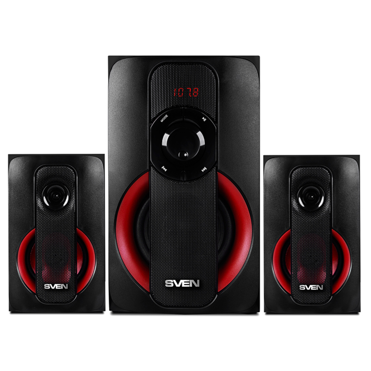 Компания SVEN представляет игровую акустическую систему с напористым звуком, богатым функционалом и агрессивным дизайном. Модель MS-304 – больше, чем просто акустика 2.1. Это настоящий центр развлечений.<br/><br/>В акустике от SVEN есть практически все, что душе угодно. Она может воспроизводить музыку с самых популярных носителей. У модели есть разъемы для SD-карты и USB flash. Она оснащена технологией Bluetooth, а это значит, что к ней можно подключиться без лишних проводов и проигрывать музыку со смартфона или планшета. А еще у MS-304 есть встроенное FM-радио. Хорошего много не бывает!<br/><br/>Акустика сделана на совесть. Ее корпус выполнен из дерева. На лицевой панели расположен информативный LED-дисплей, отображающий режимы работы устройства. За удобство управления отвечает эргономичный пульт ДУ.<br/><br/>И, конечно, самое главное в этой модели – это звук. Громкий, напористый, убедительный. SVEN MS-304 добавит игре реалистичности. Модель отлично справляется со звукопередачей спецэффектов. Кроме того, она уверенно и качественно воспроизводит музыку самых разных жанров.