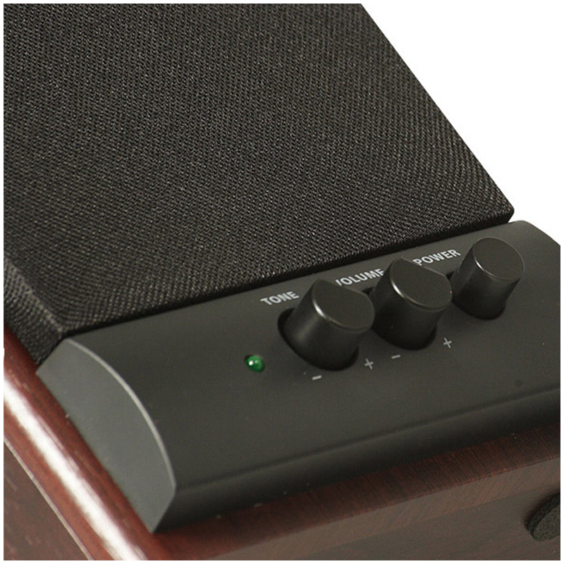 Регуляторы уровня громкости и тембра ВЧ расположены на передней панели корпуса, также как и выключатель питания. Это очень удобно, так как все настройки находятся под рукой. На задней стенке расположены разъемы для подключения различных источников аудиосигнала: ПК, DVD/CD/MP3-плееров.