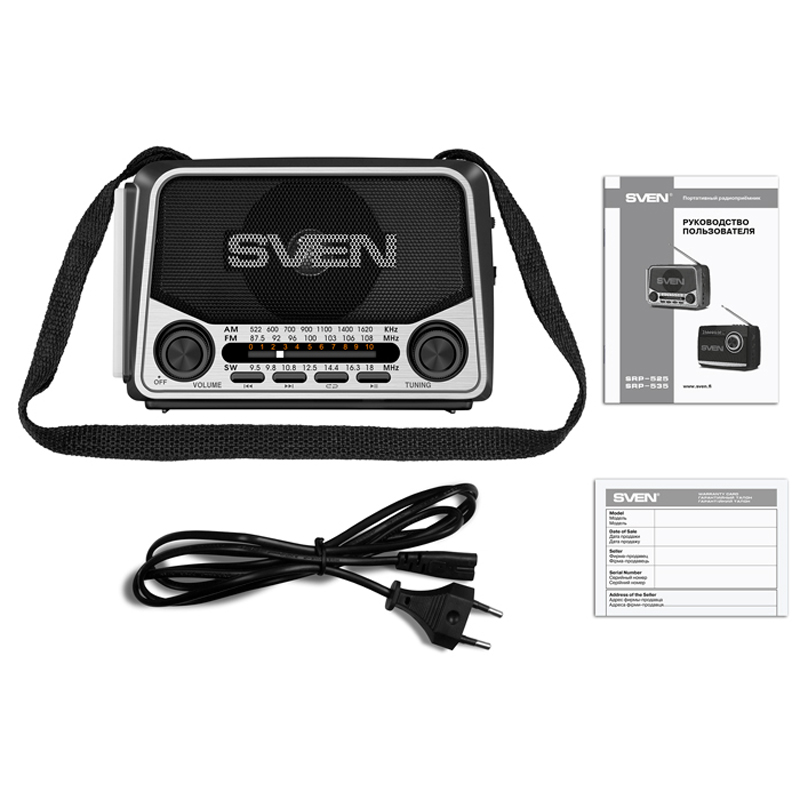 Если вы думаете, что такие устройства как переносные радиоприемники безнадежно устарели, значит, вы просто не пользовались портативными приемниками компании SVEN. Это современные акустические системы, в которых новейшие технологии упакованы в красивый корпус в стиле ретро.<br/><br/>Линейка радиоприемников SVEN пополнилась моделью SRP-525. Устройство имеет встроенное FM/AM/SW радио, поворотную телескопическую антенну, возможность воспроизведения музыки с USB flash и microSD карт памяти и встроенную батарею.<br/><br/>Радиоприемник компактного размера и имеет в комплекте удобный ремешок для переноски. Модель имеет «теплый ламповый» дизайн и представлена в двух цветах: черном и красном.<br/><br/>SVEN SRP-525 – отличный попутчик для поездок, путешествий и прогулок. Он легкий, удобный, компактный и многофункциональный, не займет много места и не оставит вас без любимой музыки.<br/>Причина уценки: механические повреждения упаковки