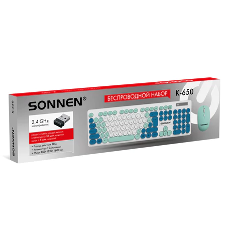 Набор беспроводной: клавиатура 104 клавиши, мышь 4 кнопки, SONNEN K-650, белый/мятный/бирюзовый, 513953