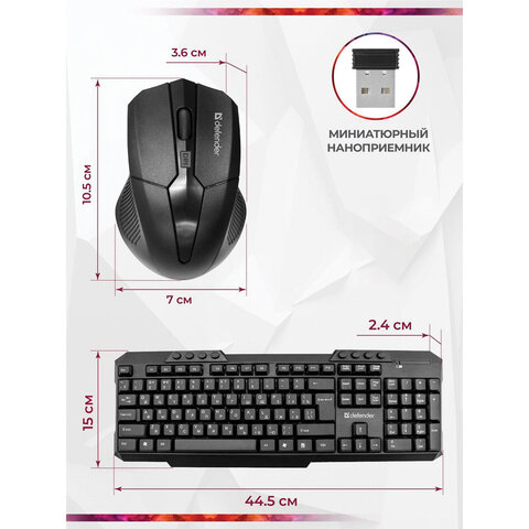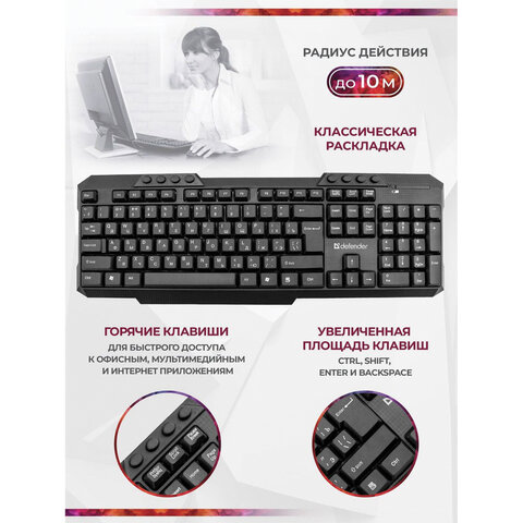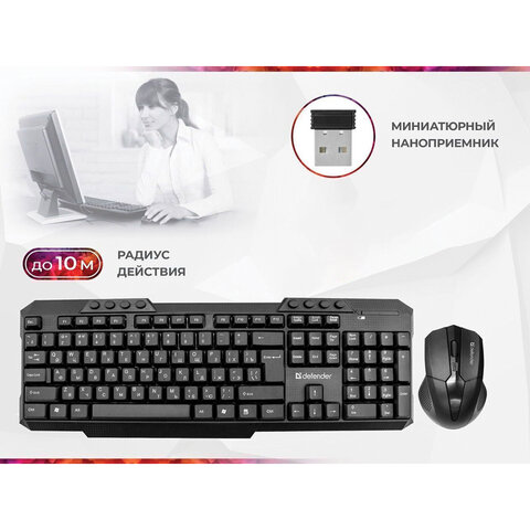 Набор беспроводной DEFENDER Milan C-992 RU, клавиатура, мышь 2 кнопки+1 колесо-кнопка, черный, 45992