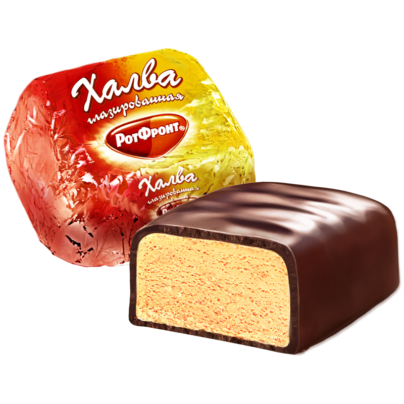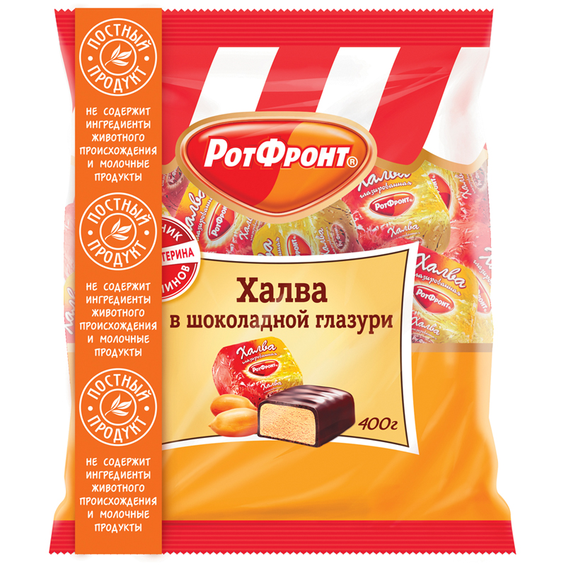 Золотистая арахисовая халва от фабрики «Рот Фронт» с насыщенным ореховым вкусом, покрытая темной шоколадной глазурью. Слоистая, чуть рассыпчатая структура халвы легонько хрустит на зубах, раскрывая сладость и аромат арахиса. Легкие ванильные нотки придают вкусу нежности, темная, чуть терпкая шоколадная глазурь прекрасно дополняет нежную сладость халвы.<br/>Производитель: ОАО «Рот Фронт».