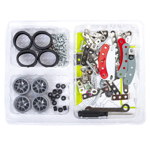 Каждый элемент металлического конструктора BAMBOX "Гоночный болид" продуман до мелочей. Круглые отверстия упрощают соединение деталей, а набор инструментов позволяет надежно закрепить их винтами и гайками.
