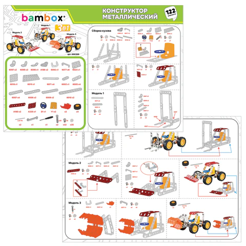 Каждый элемент металлического конструктора BAMBOX "Техника 3 в 1" продуман до мелочей. Круглые отверстия упрощают соединение деталей, а набор инструментов позволяет надежно закрепить их винтами и гайками.