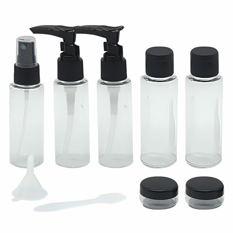 Дорожный набор пластиковых флаконов DASWERK идеально подойдет для путешествия, тренажерного зала, роддома, бассейна и любой другой ситуации, когда вы вдали от дома. Больше нет необходимости носить с собой большие, тяжелые бутылки. Наполните флаконы любимыми косметическими средствами и они всегда будут с Вами. Наши баночки для путешествий идеально подойдут для шампуней, масел, бальзамов, кремов и других косметических средств. Вы сможете легко и быстро заполнить емкости с помощью входящих в комплект аксессуаров. В комплекте также представлена удобная косметичка на зип-локе и 12 водостойких наклеек.
