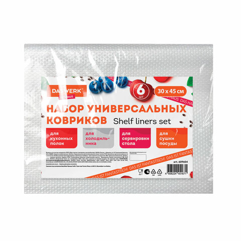 Набор универсальных хозяйственных ковриков DASWERK включает в себя шесть ковриков прямоугольной формы, размер которых 30х45 см. Коврики DASWERK станут незаменимой вещью во всем доме и на даче – коврики обеспечивают защиту любой поверхности от воздействия влаги, от жира, от пятен, а также от царапин и других механических повреждений. Главное достоинство ковриков – это их универсальность: Вы сможете использовать их для полок холодильника, выдвижных ящиков, эстетичной сервировки стола в качестве плейсмата, сушки посуды и полок с обувью. Помимо этого, можно постелить коврики на подоконник под горшки с комнатными растениями, а также оборудовать зону кормления домашних питомцев, на уборку которой не придется тратить много времени. При необходимости коврики легко режутся ножницами для получения фрагментов требуемого размера и формы.