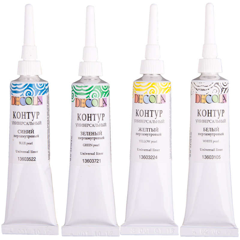 Контуры для декоративно-прикладного творчества на основе водной акриловой дисперсии предназначены для создания объемных рисунков на различных поверхностях, таких как металл, дерево, керамика, стекло, пластик, ткань, холст и т.д. Контуры 4-х перламутовых цветов. В тубах с насадкой по 18мл.