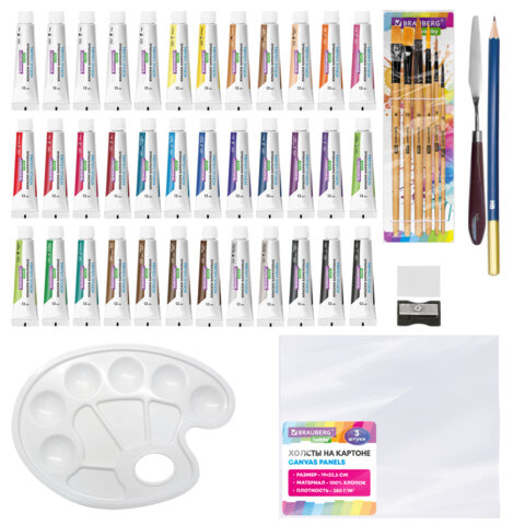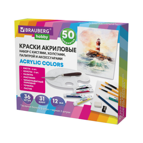 Краски акриловые художественные 26 штук по 12мл, холсты 3шт, кисти 6шт, аксессуары, 37 предметов, BRAUBERG HOBBY, 192544