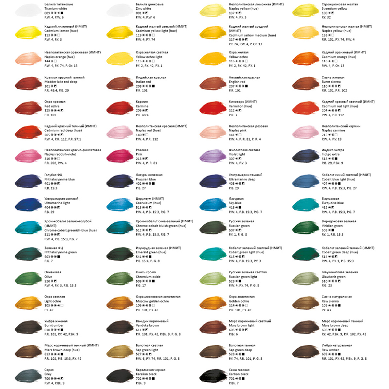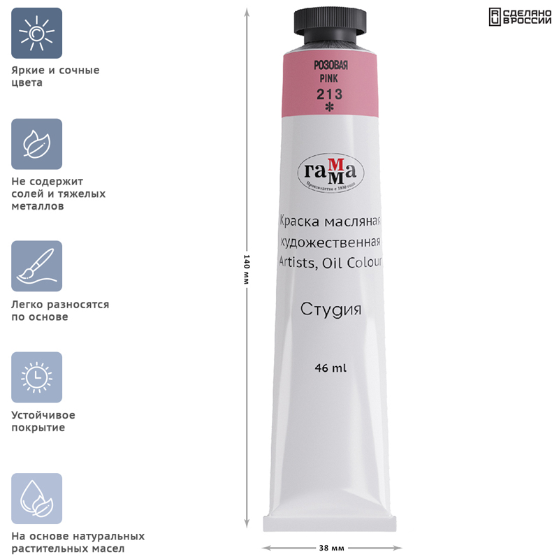 Масляные краски "Гамма" серии "Студия" изготавливаются из льняного масла, органических и неорганических пигментов. Кадмиево- кобальтовая группа заменена имитацией, что делает краски безопасными. Также в состав красок входит пчелиный воск, он придает краскам пастозную консистенцию и предотвращает от растрескивания после высыхания. Цветовой диапазон включает в себя как укрывистые краски, так и прозрачные. Масляные краски подходят для обучения и начинающих художников.