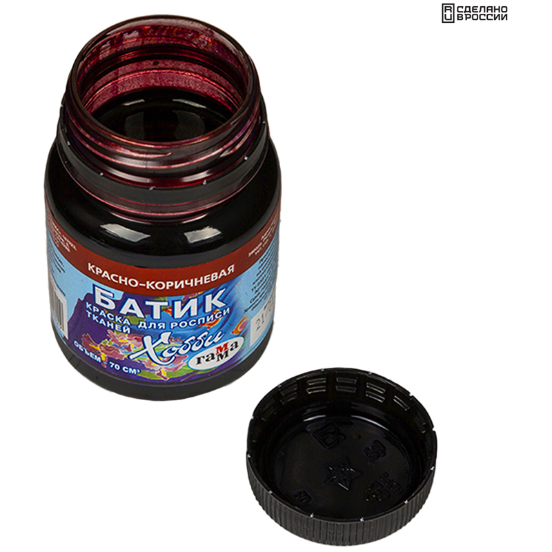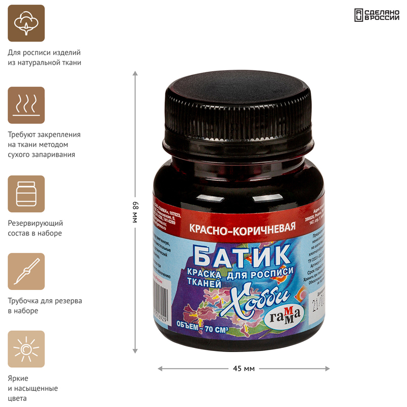 Краска по ткани ГАММА серии «Батик-акрил» красно-коричневого цвета подходит для создания рисунков на одежде из натуральных тканей — платках, салфетках, шарфиках. После того, как работа закончена, необходимо закрепить краски на ткани методом сухого запаривания. Так роспись сохранится надого и не исчезнет после первой стирки. Объём баночки с завинчивающейся крышкой — 70 мл.
