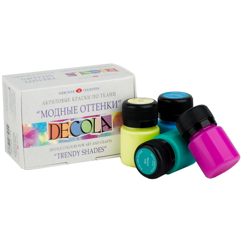 Акриловые краски по ткани "Decola" предназначены для художественного декорирования тканей в технике свободной росписи, с использованием трафаретов и штампов. Густая консистенция препятствует растеканию краски по ткани и обеспечивает ее равномерное распределение плотным слоем. С течением времени яркие и сочные цвета красок не смываются и не тускнеют. Для изменения консистенции краски используется специальный разбавитель "Decola" для красок по ткани. Для удобства банки в наборах оснащены стикерами на крышках с указанием цвета и типа краски.