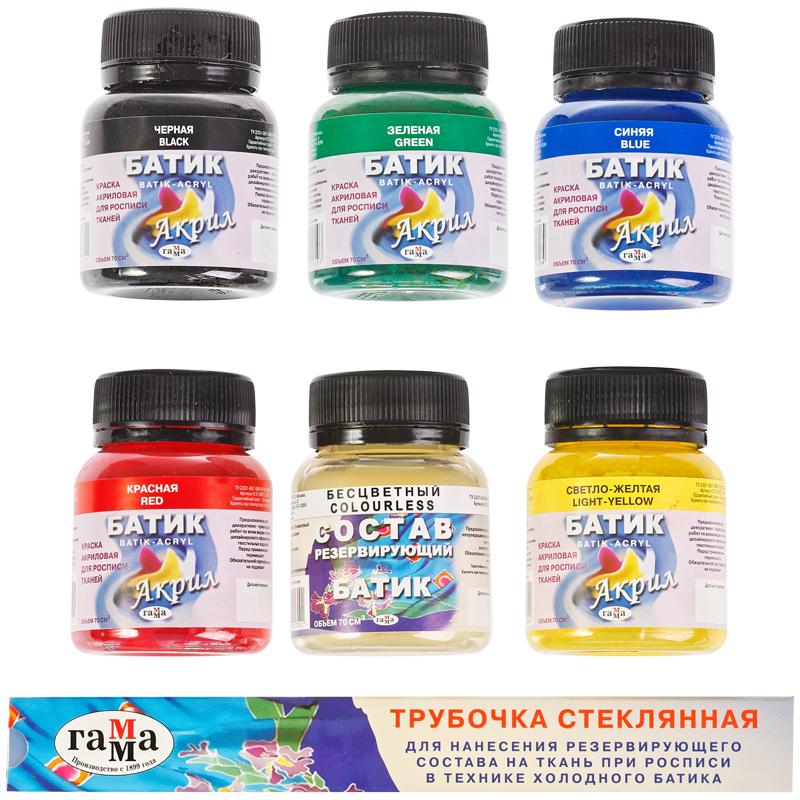 Яркие краски для росписи тканей серии «Батик-акрил» подходят для создания рисунков на одежде из натуральных тканей — платках, салфетках, шарфиках. После того, как работа закончена, необходимо закрепить краски на ткани методом сухого запаривания. Так роспись сохранится надого и не исчезнет после первой стирки. В набор входят баночки с красками 5 цветов: чёрный, зелёный, синий, светло-жёлтый, красный, а также баночка резервирующего состава и трубочка для нанесения. Объём каждой баночки с завинчивающейся крышкой — 70 мл, общий объём — 350 мл.