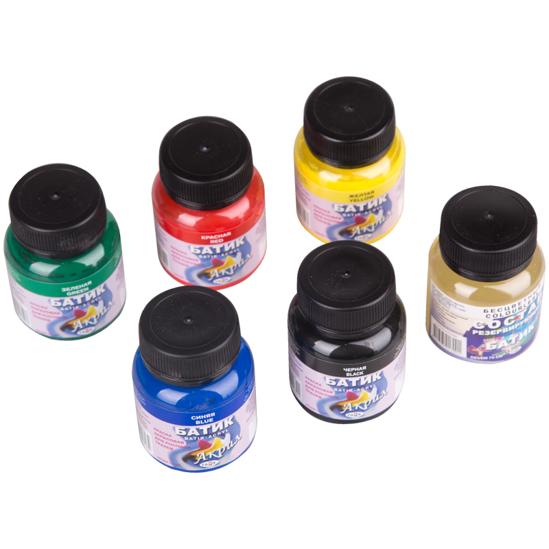 Яркие краски для росписи тканей серии «Батик-акрил» подходят для создания рисунков на одежде из натуральных тканей — платках, салфетках, шарфиках. После того, как работа закончена, необходимо закрепить краски на ткани методом сухого запаривания. Так роспись сохранится надого и не исчезнет после первой стирки. В набор входят баночки с красками 5 цветов: чёрный, зелёный, синий, светло-жёлтый, красный, а также баночка резервирующего состава и трубочка для нанесения. Объём каждой баночки с завинчивающейся крышкой — 70 мл, общий объём — 350 мл. <br/>• Количество цветов: 5;<br/>• Упаковка: пластиковая баночка с завинчивающейся крышкой;<br/>• Объём баночки: 70 мл.