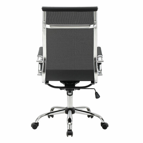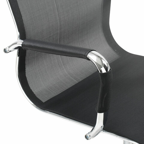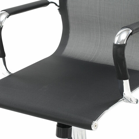 Кресло выполнено на основе хромированного металлического каркаса с прочной сеткой.