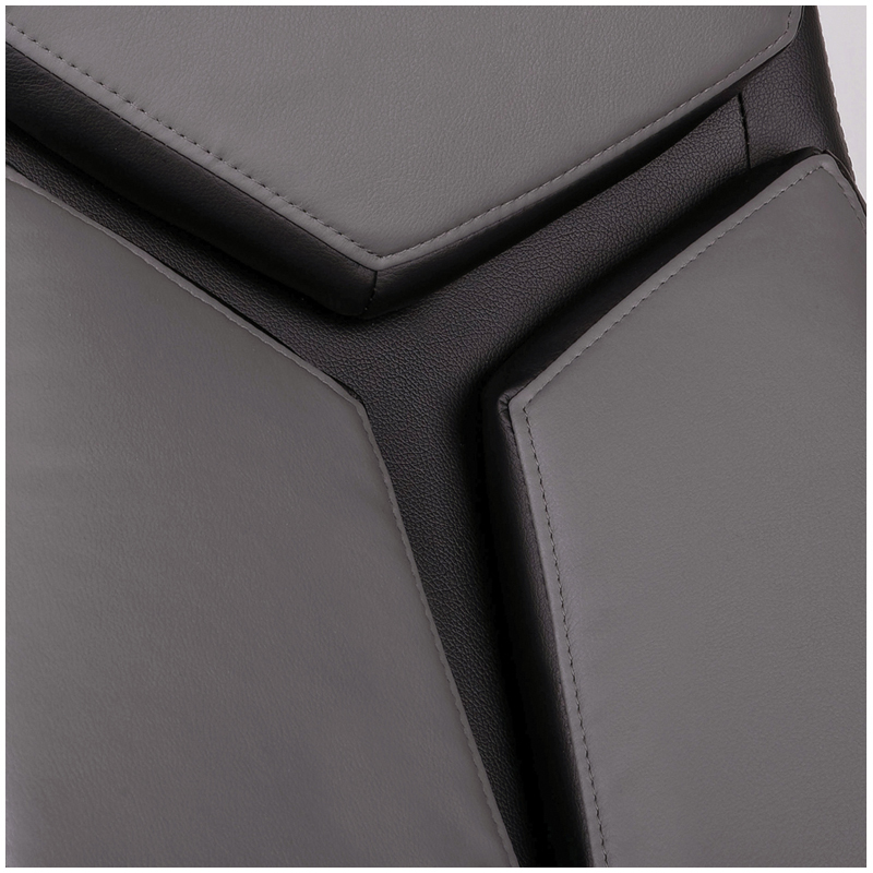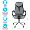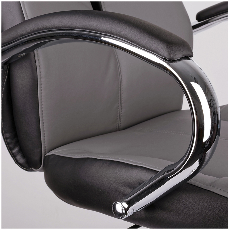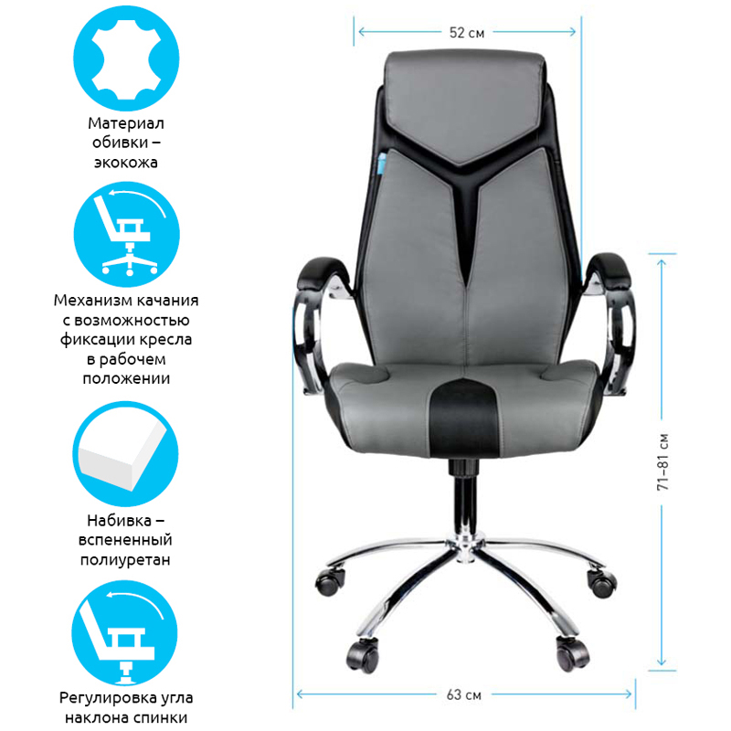 Механизм качания с возможностью фиксации кресла в рабочем положении. Каркас – немонолитный, материал набивки – вспененный полиуретан, крестовина – хромированный металл, материал обивки – чёрно-серая экокожа. Гарантийный срок – 12 месяцев.