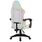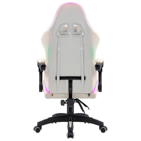 Кресло оснащено шейной и поясничной подушками, мягкими подлокотниками, RGB подсветкой, а также механизмом, регулирующим уровень наклона спинки.