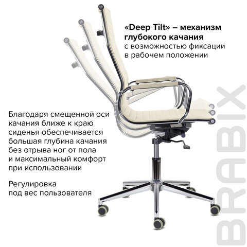 Механизм качания "Deep Tilt" - это возможность глубоко раскачиваться в кресле, а также фиксация в одном рабочем положении. А благодаря смещенной оси качания ближе к краю сиденья ноги пользователя не отрываются от пола в отличие от обычного механизма качания "Top Gun". Механизм "Deep Tilt" отличается от других своей прочностью, надежностью, а также плавностью хода.
