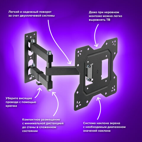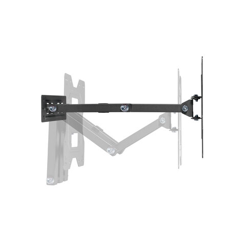 Поворотно-наклонная конструкция кронштейна обладает широкими возможностями регулировки: позволяет наклонять экран на 3° вверх и 10° вниз, поворачивать на 90° вправо и влево, выдвигать от стены на расстояние 56 - 378 мм. Все это поможет Вам подобрать оптимальный угол обзора для вашего комфорта.