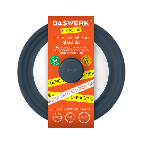 Универсальная крышка DASWERK, выполненная из силикона и стекла, позволит сэкономить не только время, но и пространство на кухне: одну крышку можно использовать для посуды разных размеров: 16 см, 18 см и 20 см в диаметре.