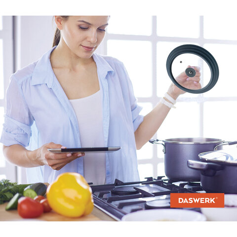 Больше не нужно хранить гору стеклянных крышек разного размера, универсальная крышка DASWERK существенно сэкономит место на кухне.
