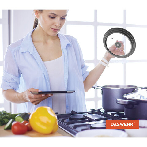 Больше не нужно хранить гору стеклянных крышек разного размера, универсальная крышка DASWERK существенно сэкономит место на кухне.