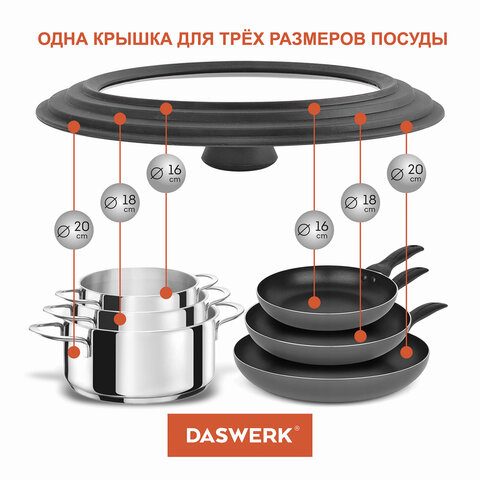 Универсальная крышка DASWERK, выполненная из силикона и стекла, позволит сэкономить не только время, но и пространство на кухне: одну крышку можно использовать для посуды разных размеров: 16 см, 18 см и 20 см в диаметре.