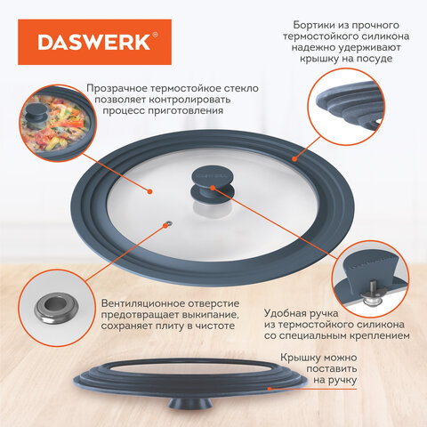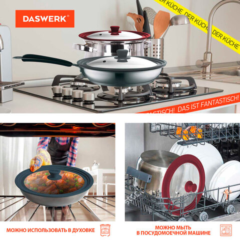 Крышка DASWERK изготовлена из термостойкого стекла, что позволяет контролировать процесс приготовления без потери тепла. Ободок из экологичного жаропрочного силикона выдерживает температуру до 220°С.