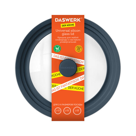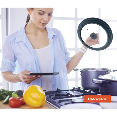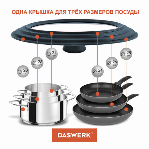 Универсальная крышка DASWERK, выполненная из силикона и стекла, позволит сэкономить не только время, но и пространство на кухне: одну крышку можно использовать для посуды разных размеров: 24 см, 26 см и 28 см в диаметре.