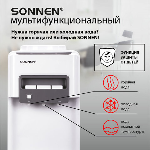 Напольный кулер SONNEN FSC-03AC обеспечит питьевой холодной и горячей водой сотрудников и посетителей предприятий, офисов и других организаций.