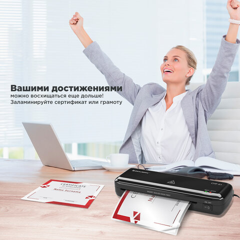 Способен заламинировать документы различных размеров – от визитки до листа формата А4. Ламинирует 1 документ формата А4 в пакетах толщиной 2х60, 2x75, 2x80, 2x100, 2х125 и 2х150 мкм за 1 минуту.
