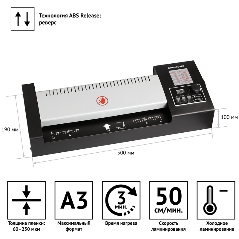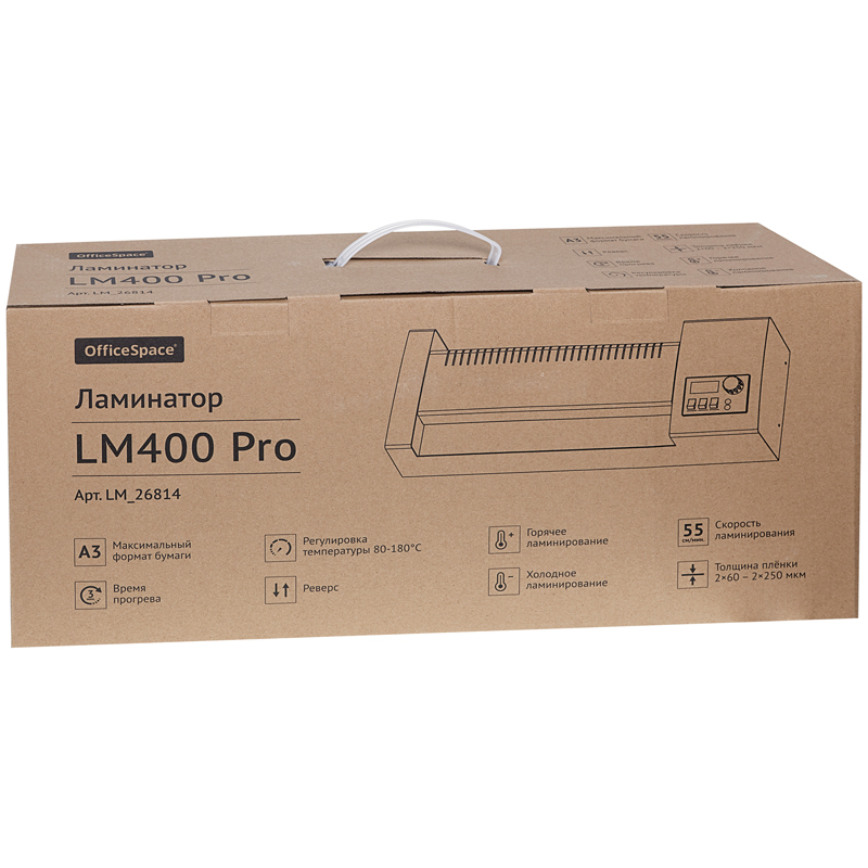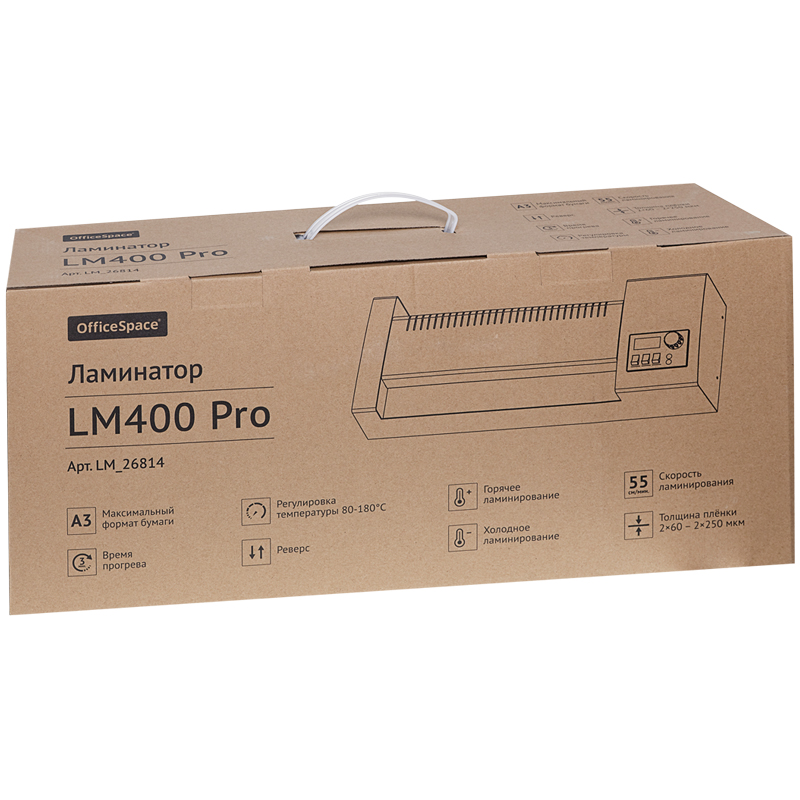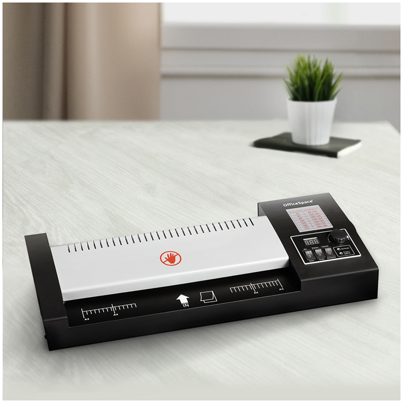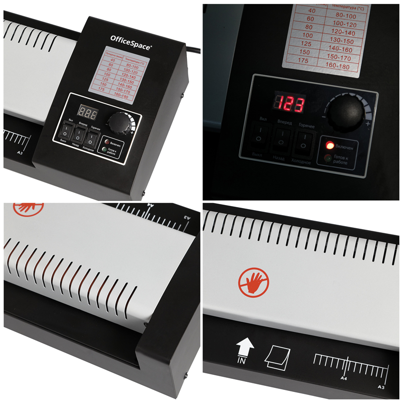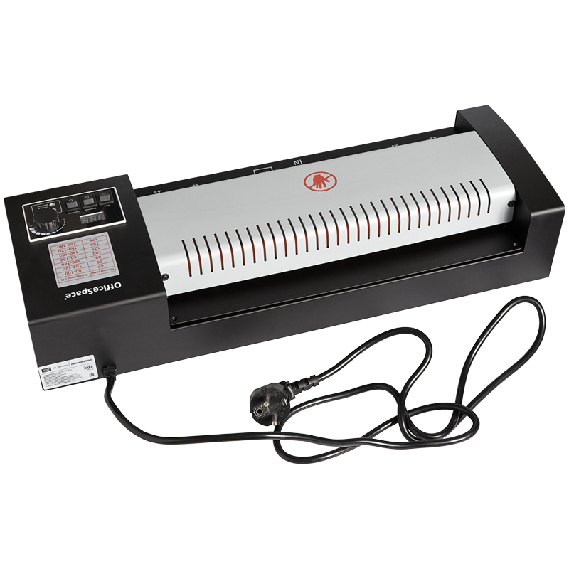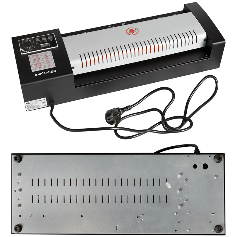 Ламинатор OfficeSpace LM400 предназначен для ламинирования бумаги, фотографий, документов, грамот, пропусков для защиты от влаги, пыли и прочих внешних воздействий. Скорость ламинирования – 50 см в минуту. Максимальный формат документа – А3. Толщина пленки от 60 до 250 мкм. Металлический корпус и удобная система управления с LED–интерфейсом. Время нагрева – 3 минуты. Ширина входного отверстия – 320 мм. <br/>Ламинатор оснащен 4 валами, что обеспечивает более высокое качество ламинирования по сравнению с ламинаторами с 2 валами. Благодаря высокой производительности подойдет для полупрофессионального применения, где требуется ламинирование большого количества документов. <br/>С помощью регулятора можно выставить температуру с учетом толщины ламинируемой пленки. Для освобождения замявшихся документов валы оснащены реверсом.<br/>Функция холодного ламинирования позволит нанести самоклеящуюся пленку толщиной от 60 до 250 мкм на бумагу и документы, которые нельзя подвергать воздействию высоких температур.