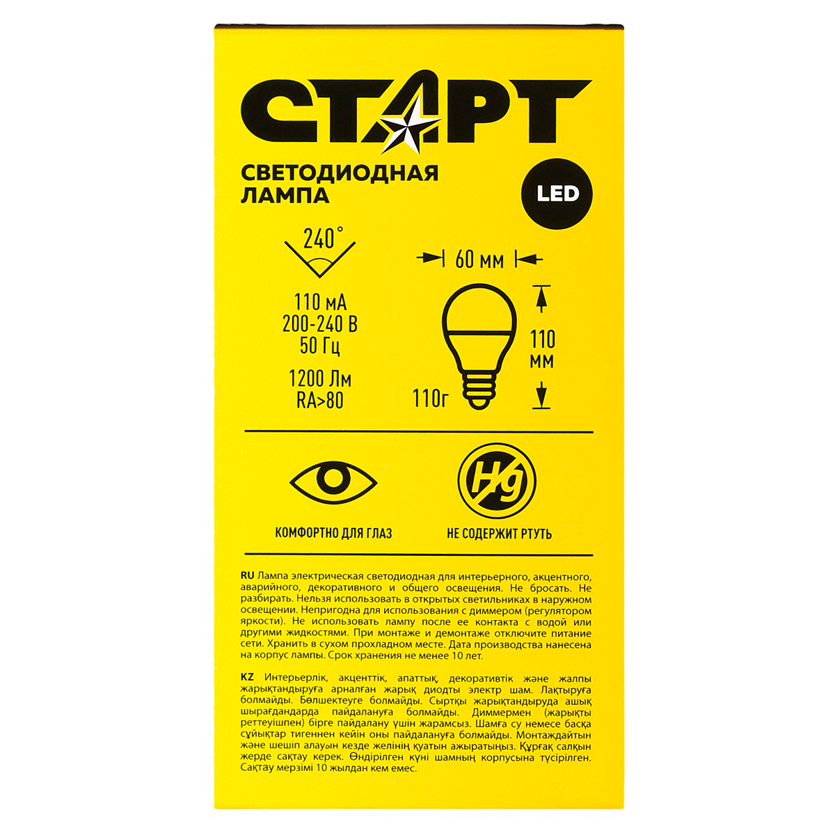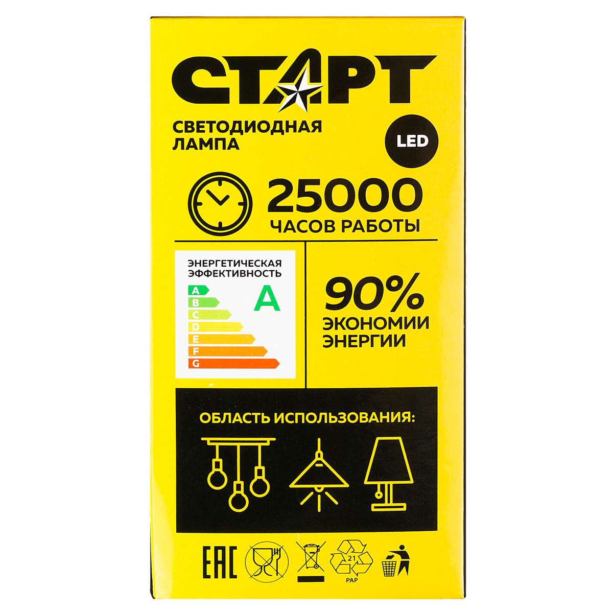Светодиодная лампа СТАРТ применяется в помещениях, где требуется много света. Яркий и мощный поток позволяет заполнить светом помещения большой площади или приусадебные участки, благодаря водонепроницаемости корпуса. <br/><br/>Эстетика и удобство использования<br/><br/>Светодиодная лампа с мощным освещением может быть использована повсеместно, как в помещениях, так и на улице. Конструкция лампы позволяет работать вне зависимости от температурных условий. Стандартный цоколь Е27 применим к любому виду осветительных приборов. <br/><br/>Экономия<br/><br/>Энергопотребление лампы составляет 15 Вт, световой поток аналогичен свету от лампы накаливания мощностью 100Вт. Особая конструкция светодиодного элемента освещения позволяет бесперебойно работать на протяжении 25 000 часов. Использование ламп данного типа принесет существенную экономию при оплате электроэнергии. <br/><br/>Безопасность<br/><br/>Микропроцессы регулируют работу светодиодов, обеспечивая защиту от перепадов напряжения и перегрева. <br/>Элемент освещения произведен из экологически чистых материалов и по окончанию срока эксплуатации лампа может быть утилизирована без специальных условий.<br/>Использование данной лампы в домашних условиях соответствует правилам и нормам безопасности.