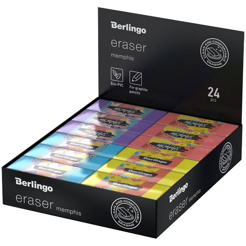 Ластик Berlingo Memphis размера 50*20*11 мм не токсичен, выполнен из ECO-PVC, не токсичен. Изделие прекрасно справляется с линиями от чернографитного карандаша, не оставляет следов и грязных разводов после себя, не повреждают бумагу. <br/>Каждый ластик упакован в картонный держатель и пленку, которые защищают ластик от грязи и пыли. У каждого изделия есть штрих-код. В ассортименте представлено 4 цвета ассорти. <br/>Поставляются в дисплей боксе.